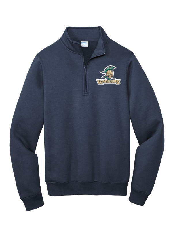 Navy 1/4 zip with embroidered Warriors Mascot on left chest