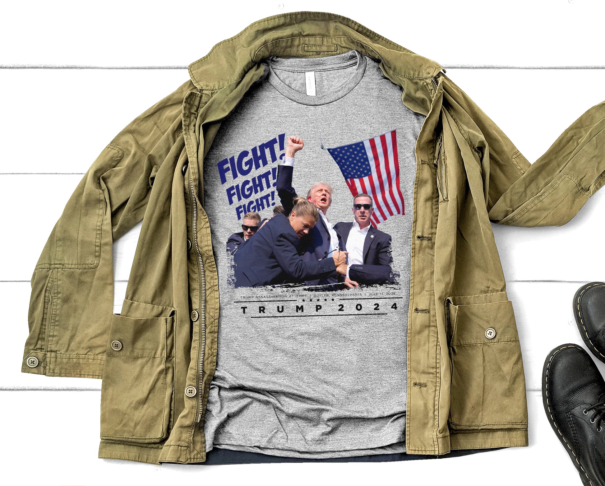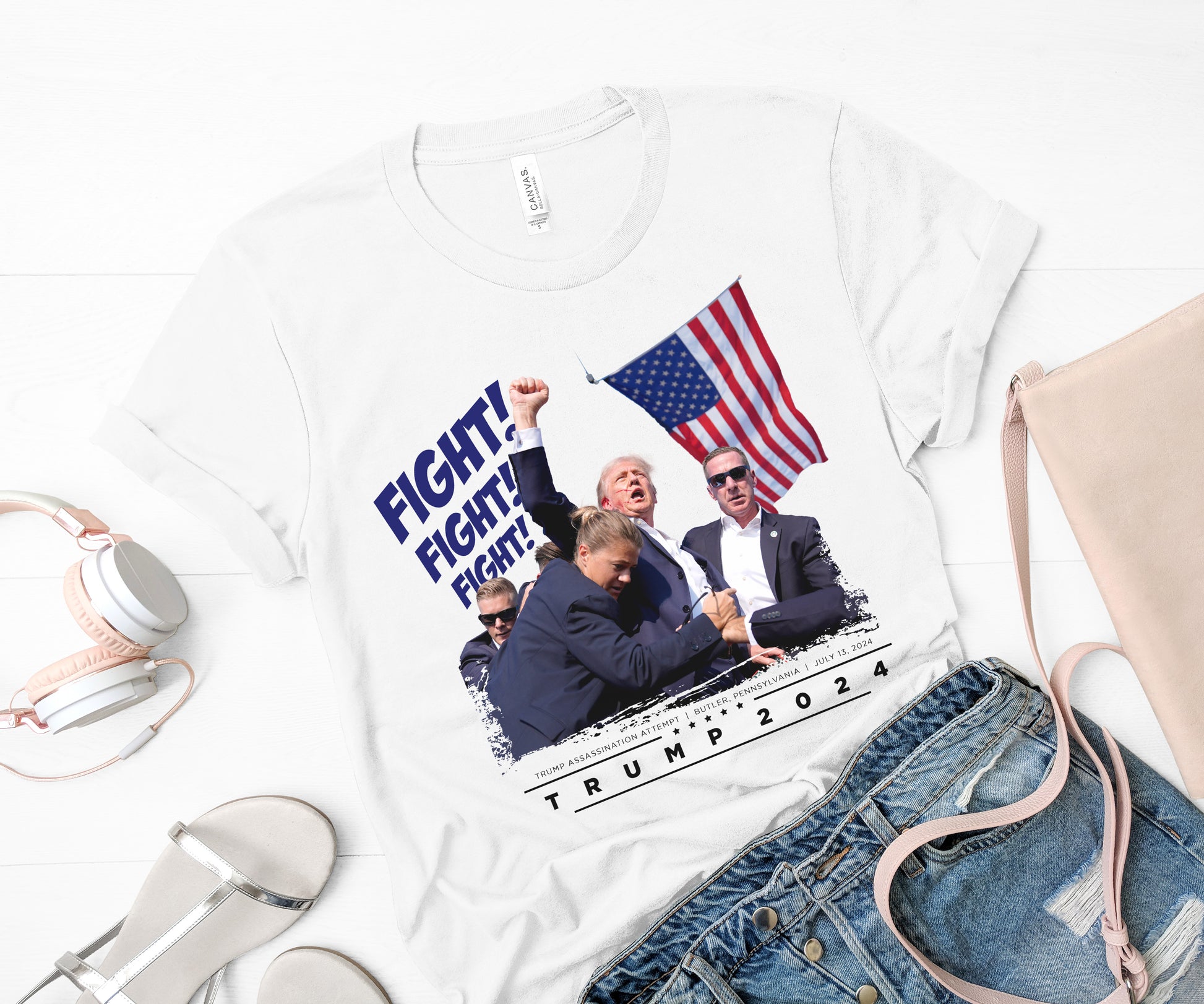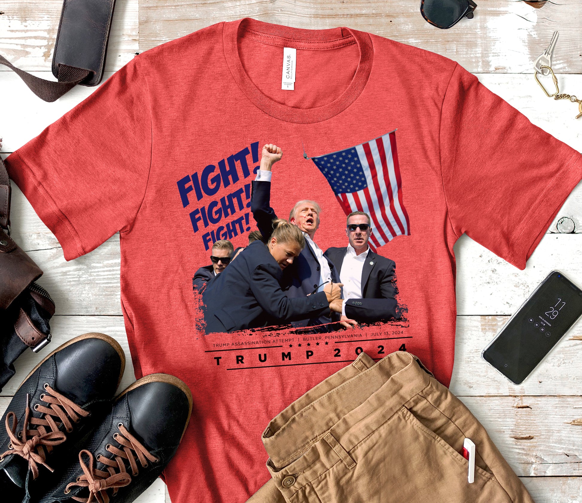 Flaunt the Fight! Trump 2024 tee and show some love for the MAGA man! This comfy, heather grey, white, or heather red Bella Canvas t-shirt features Trump's iconic photo after an assassination attempt. Show your support for Donald's 2024 campaign to Make America Great Again!