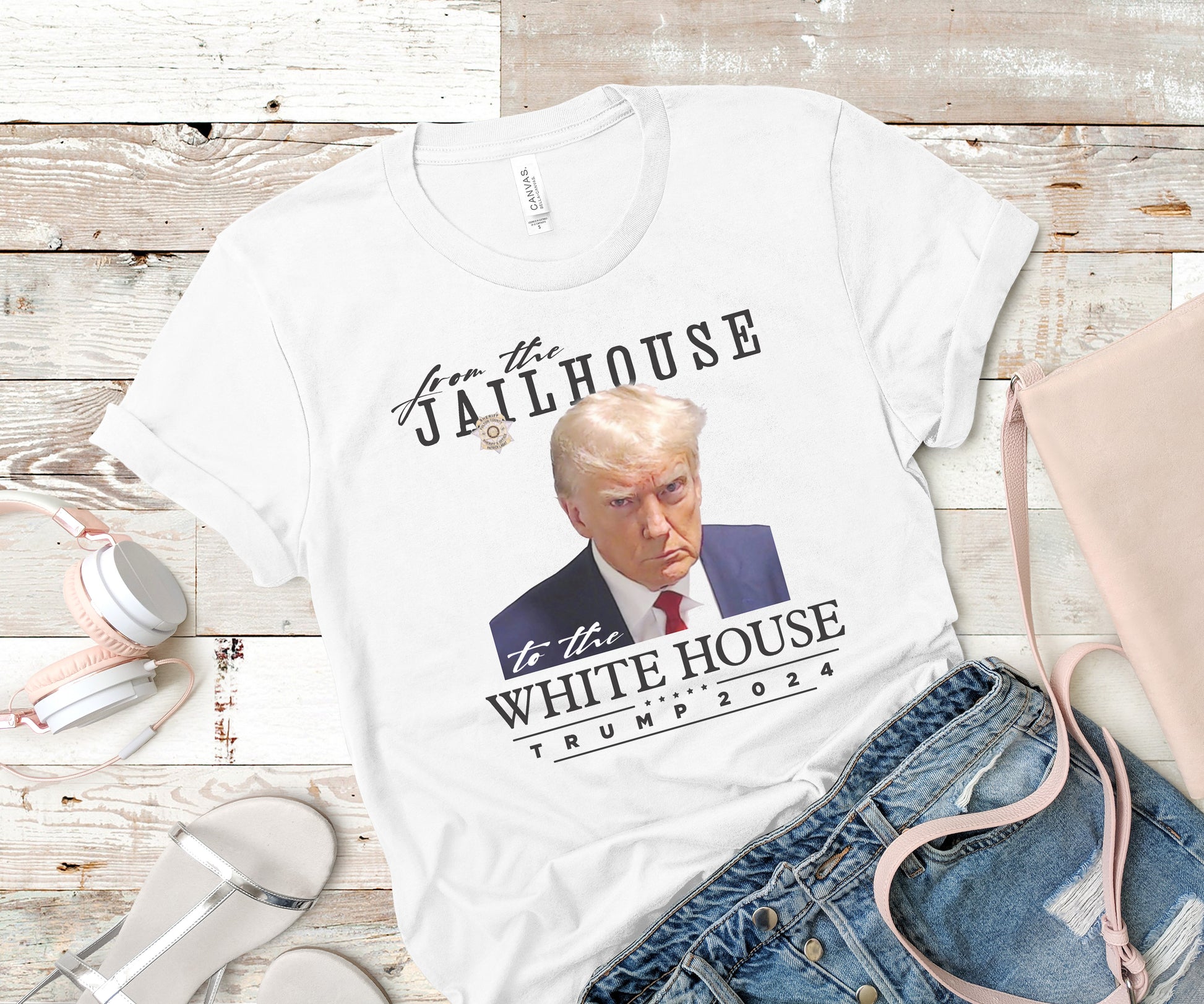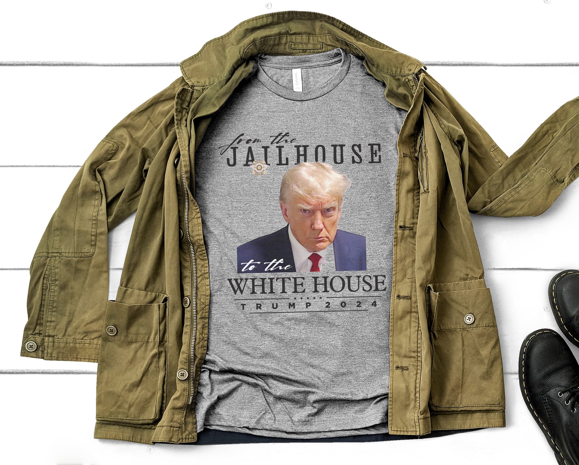 Flaunt the Jailhouse to White House Trump 2024 tee and show some love for the MAGA man! This comfy, heather grey or white Bella Canvas t-shirt features Trump's mug shot before he made his victorious exit from the clink. Show your support for Donald's 2024 campaign to Make America Great Again!