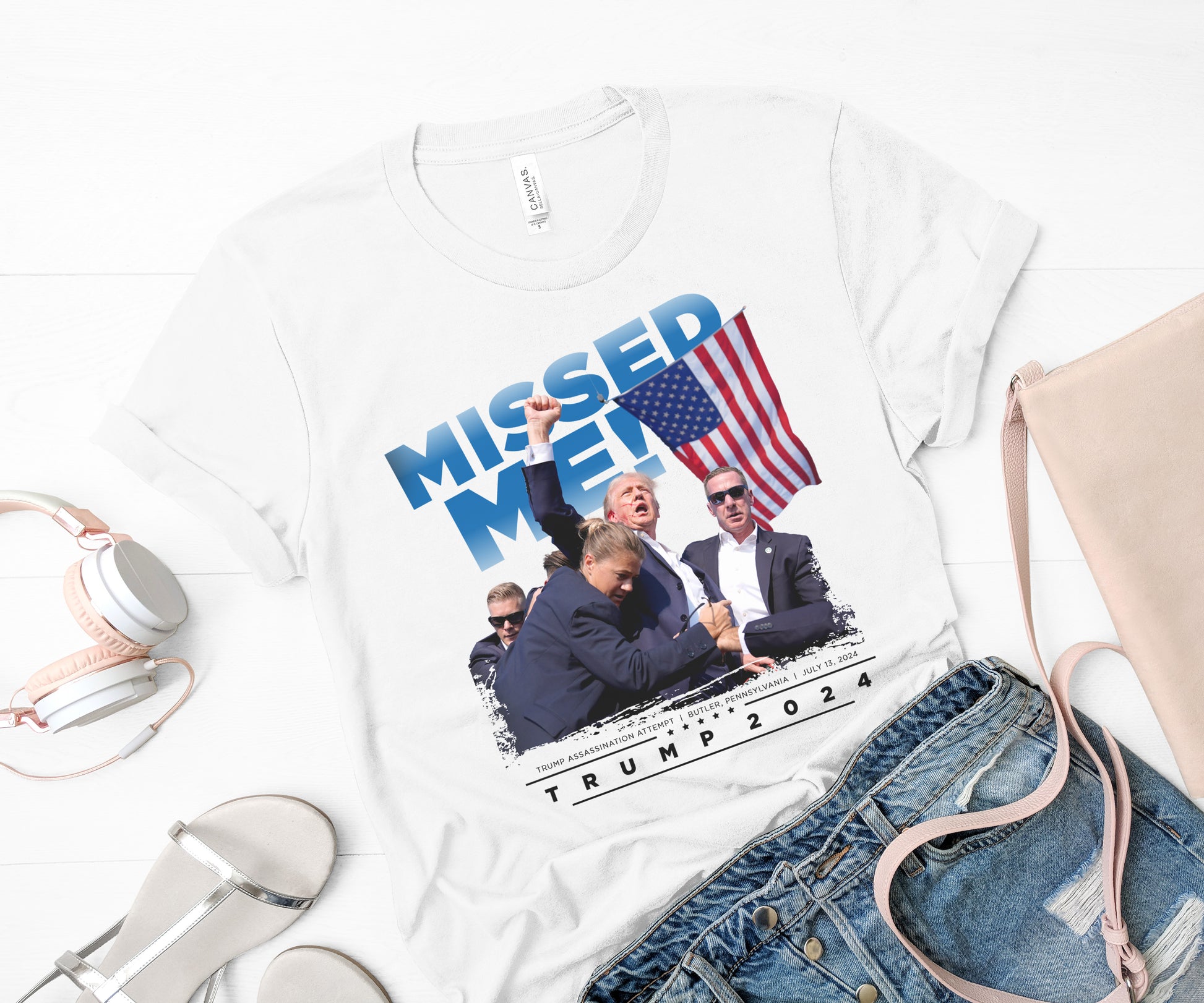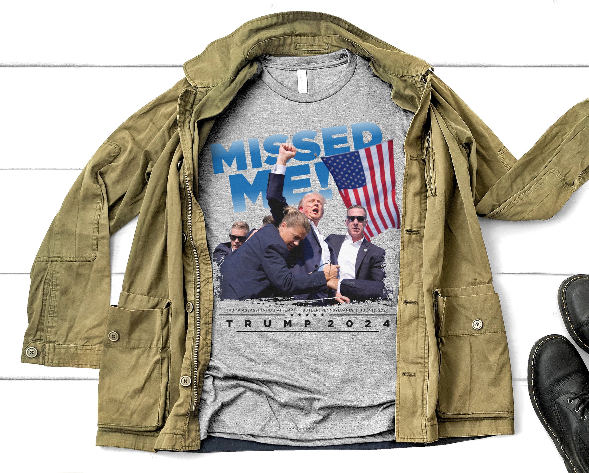 Flaunt the Missed Me Trump 2024 tee and show some love for the MAGA man! This comfy, heather grey, white, or heather red Bella Canvas t-shirt features Trump's iconic photo after an assassination attempt. Show your support for Donald's 2024 campaign to Make America Great Again!