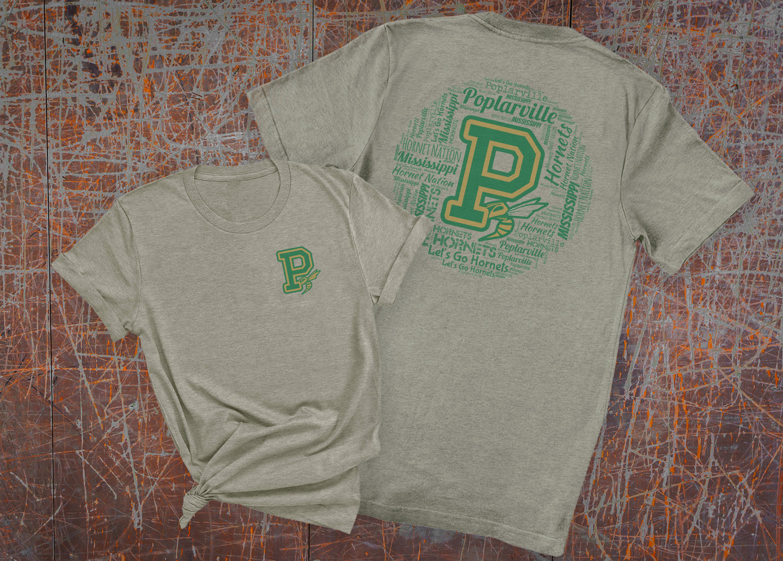 Show off your Hornet Pride with this fun spirit tee! Featuring a sublimated collage of Poplarville-related words, this tee will be your new game day fave! The perfect addition to your spirit apparel wardrobe!