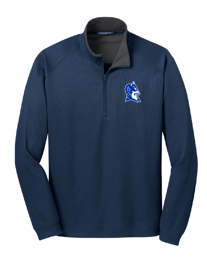 This 1/4-zip pullover boasts an inviting, vertical texture, a soft cotton interior, and a dependable 63% polyester, 37% cotton exterior that makes it perfect for layering. Features like the contrast rollover at the collar, side vents, and open hem complete the look.