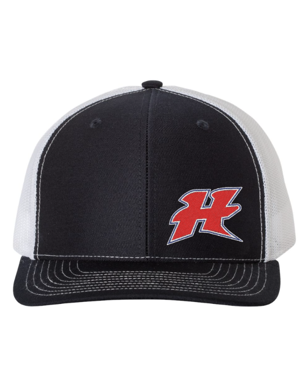 This Snapback Trucker Cap has dual tones and breathable mesh panels on the sides, with contrasting stitching on the bill. It is structured with a mid-profile and features an embroidered Hancock logo.