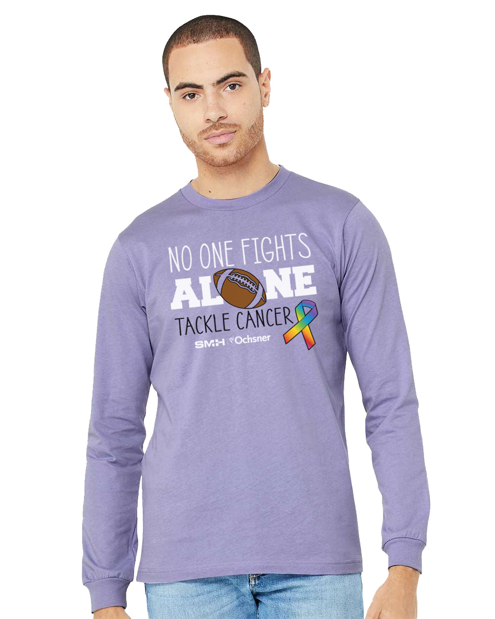 Show your support for cancer patients with our Tackle Cancer Long Sleeve tee. Made with super soft Bella+Canvas fabric, this tee is not only stylish and comfortable but also helps raise awareness for all types of cancer. With a universal cancer awareness color, you can show that no one fights alone. Let's tackle cancer together.